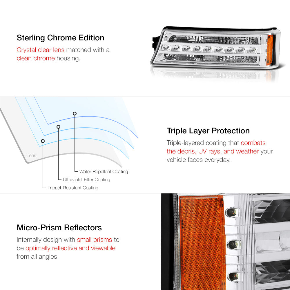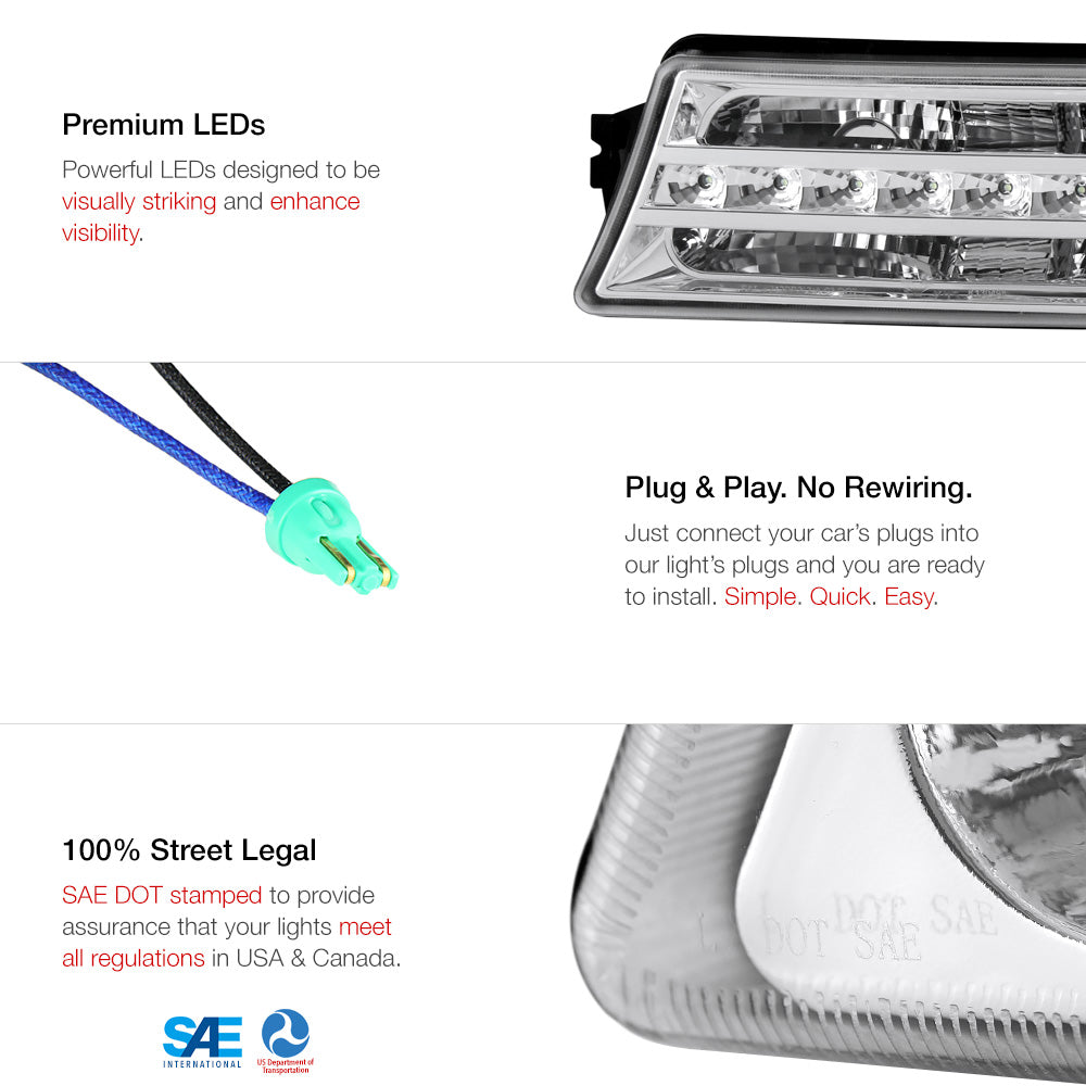 Bumper Light What's In The Box | Pair - Driver & passenger side | Built In LED - Parking What You Might Need | Re-use original bulbs - Signal, daytime running Color | Sterling Chrome - Chrome housing with transparent clear lens Brand | Spyder Auto Warranty | 60-Days Parking | Built-In LED Signal | Re-use original 3157A bulbs DRL | Re-use original 3156 bulbs