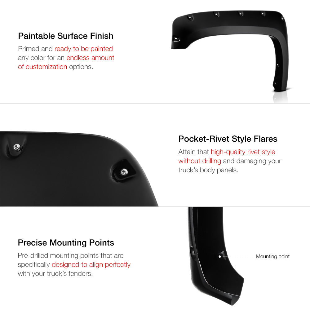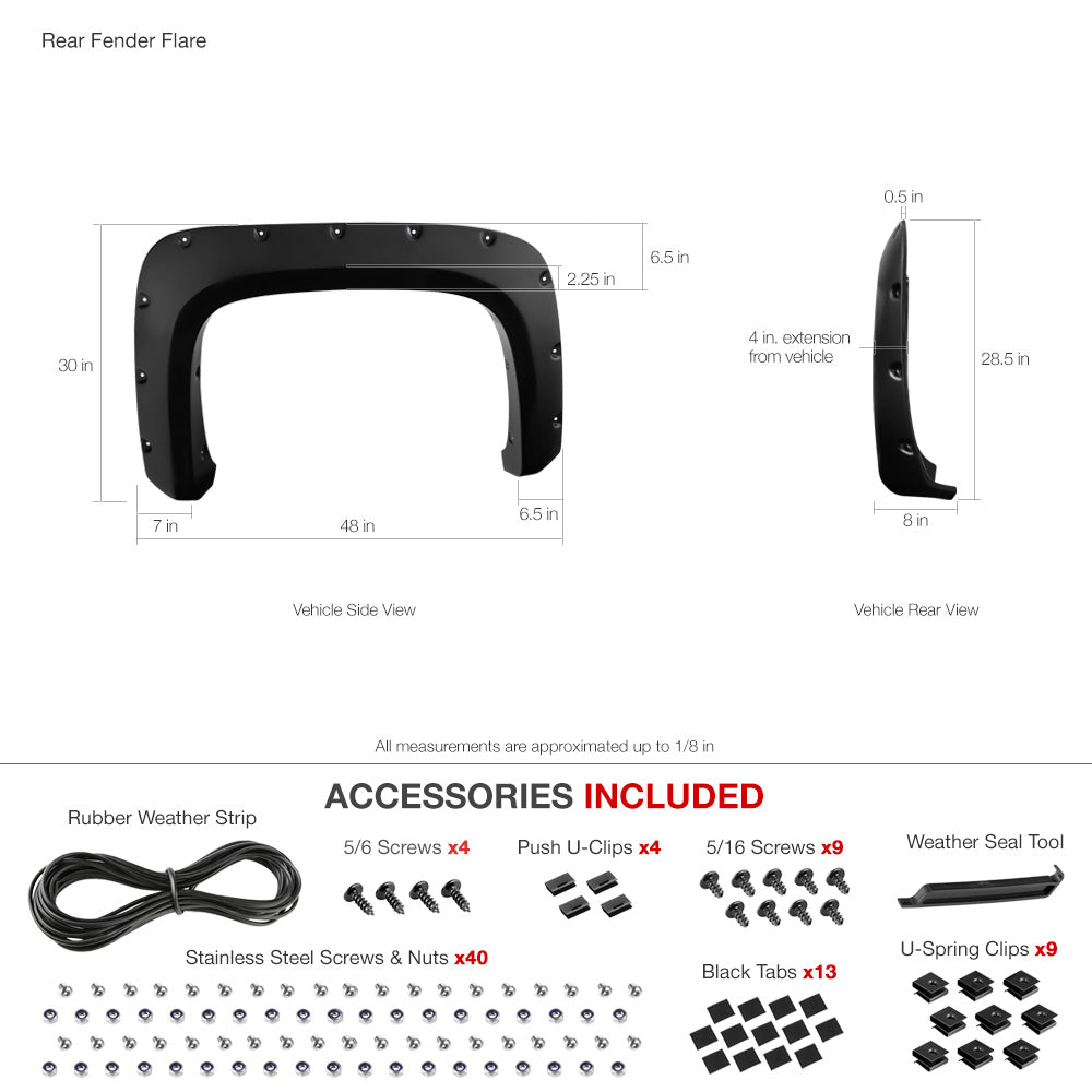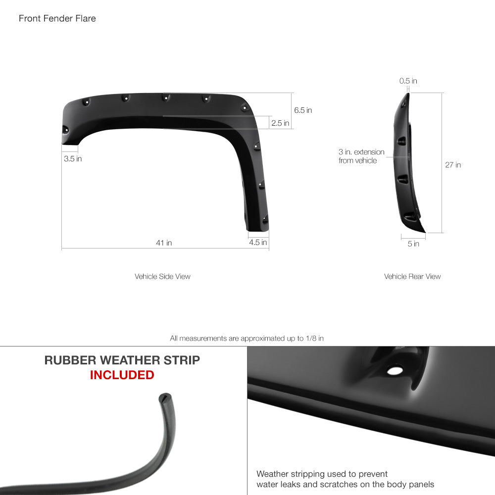 Fender Flare What's In The Box | 2 Front - Driver & passenger side | 2 Rear - Driver & passenger side | Complete hex screw & nut set | Durable rubber edge protector trim What You Might Need | Tools For Installation Color | Paintable Black - Paintable black exterior color Brand | Spyder Auto Warranty | 60-Days