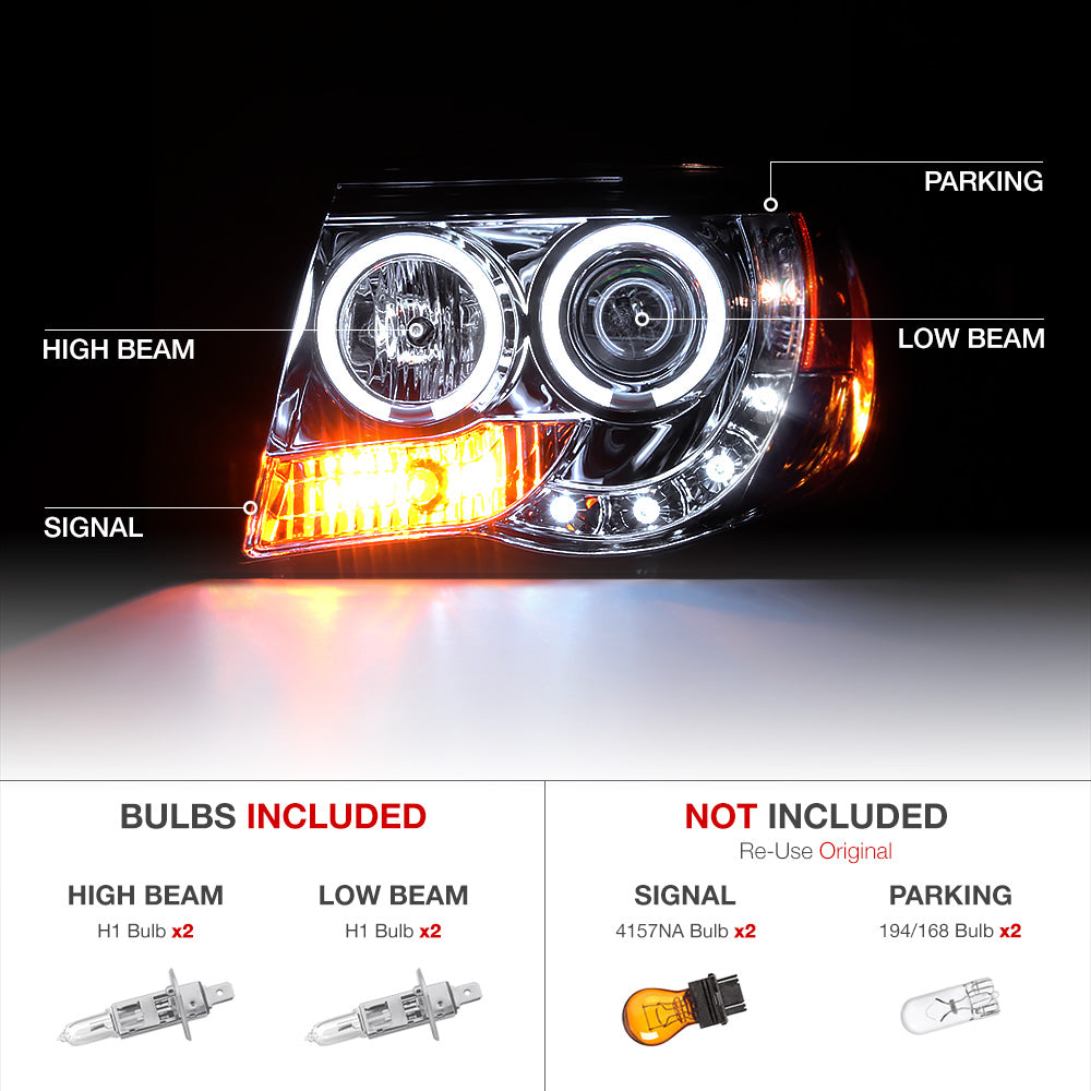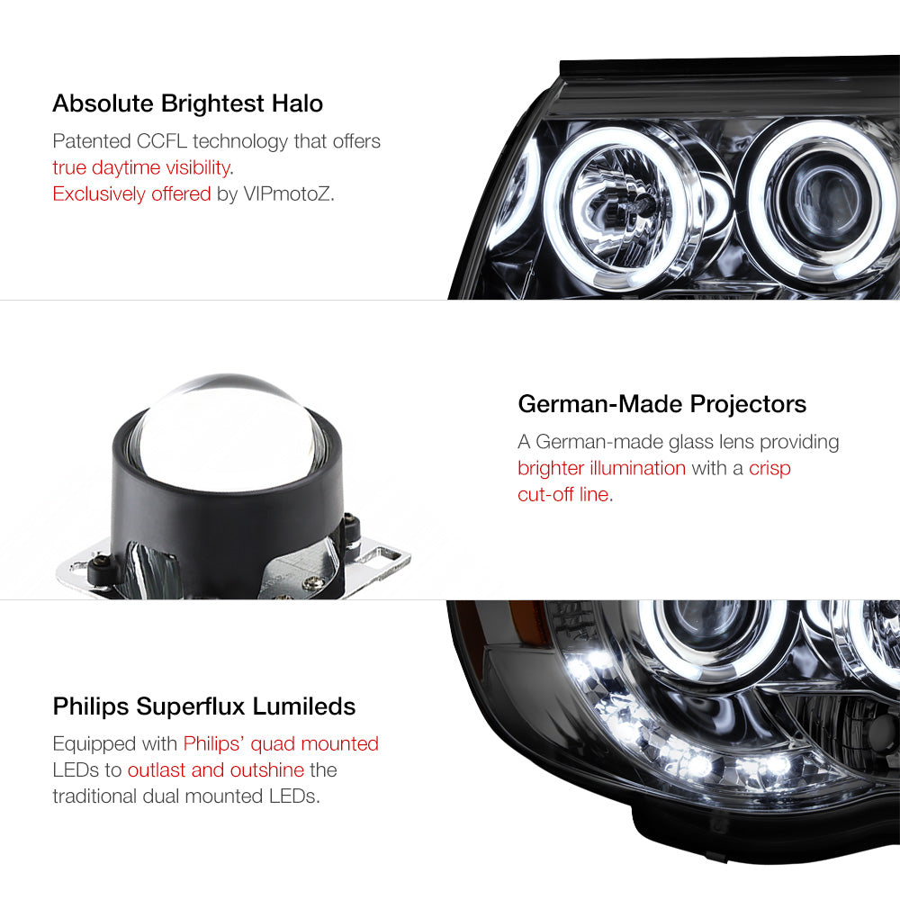Toyota Tacoma is built tough to conquer any terrain. With Tacoma, you are driving out there in the wild in hopes to find a new wild spirit. With adventure comes the night and your old headlights will be hazy or yellow. Replace your old lights for our newly designed projector headlights that provide wider, brighter light dispersal with its parabolic chrome interior. Better chrome interior with super durable housing to provide the ultimate styling to dethrone any other car on the streets. The halo rings with CCFL technology redefine your style to stand out in the crowd. With these new headlights, you are ready to conquer the unknown.